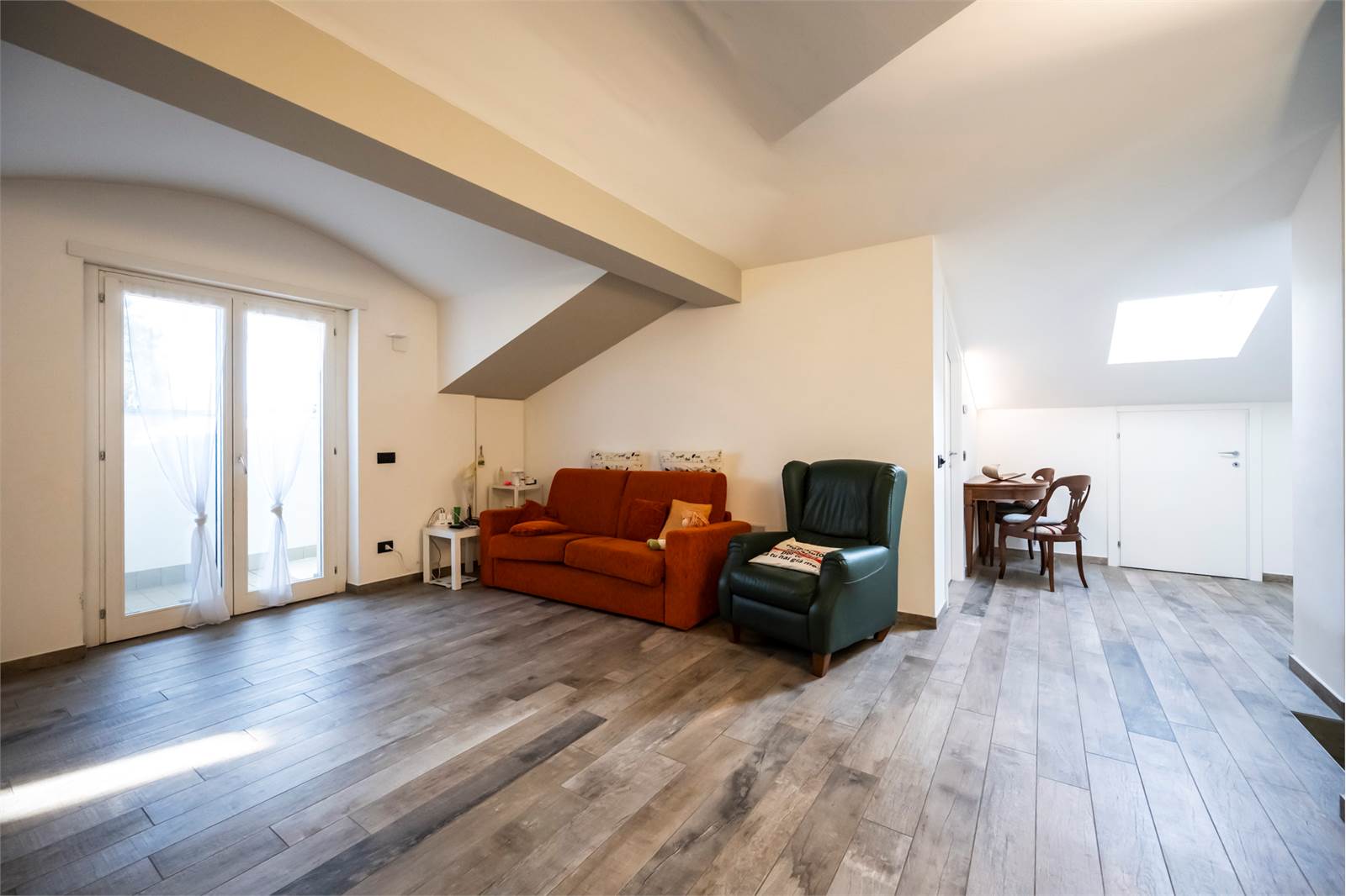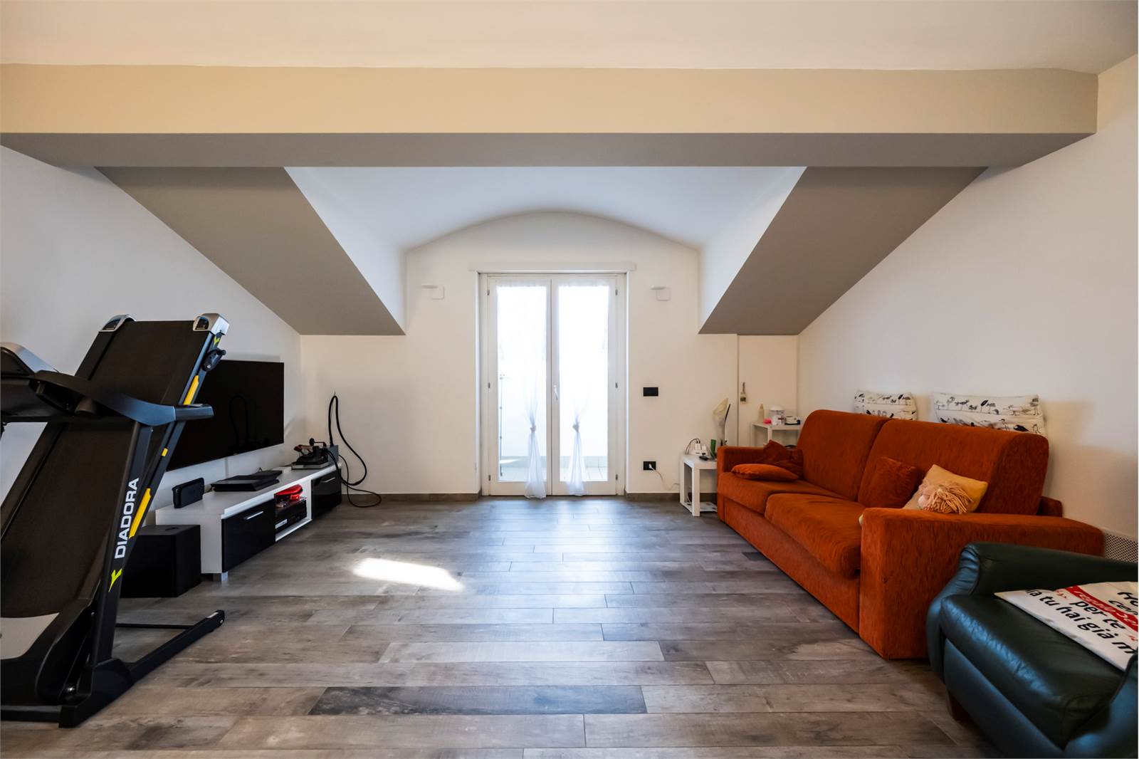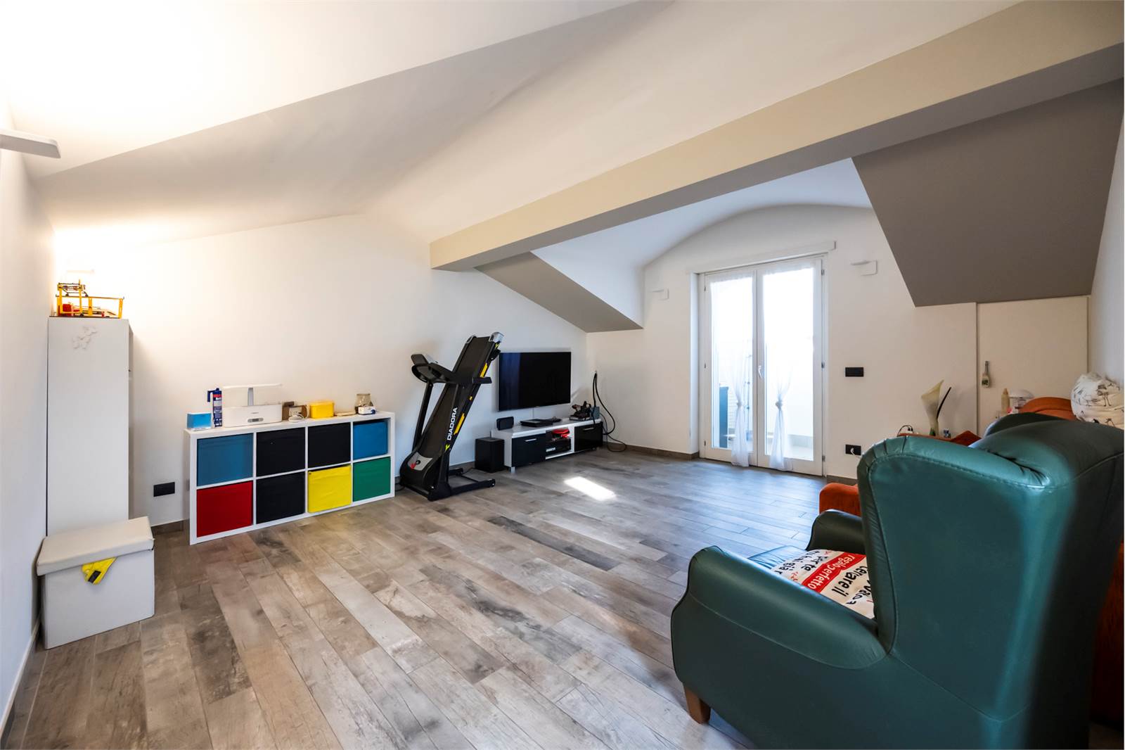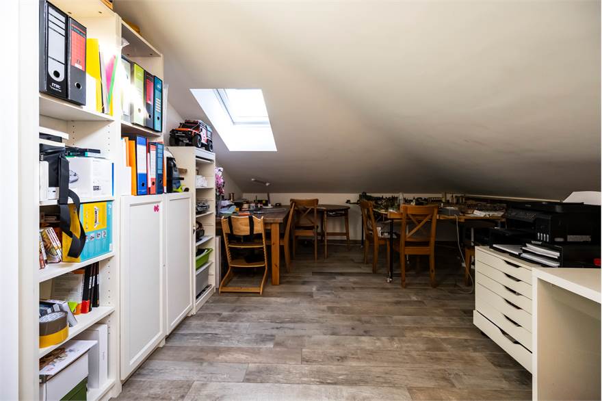 L’abitazione si sviluppa su due livelli: al piano primo si trovano un ampio e luminoso soggiorno con accesso a un terrazzino di circa 10 mq, una cucina abitabile, due camere da letto, un bagno finestrato con ampia doccia, due balconi. Al piano sottotetto, collegato internamente, si sviluppa un ampio locale agibile rifinito che offre spazi versatili e ben sfruttabili, e tre comodi ripostigli, bagno con doccia e uso lavanderia e terrazzino.