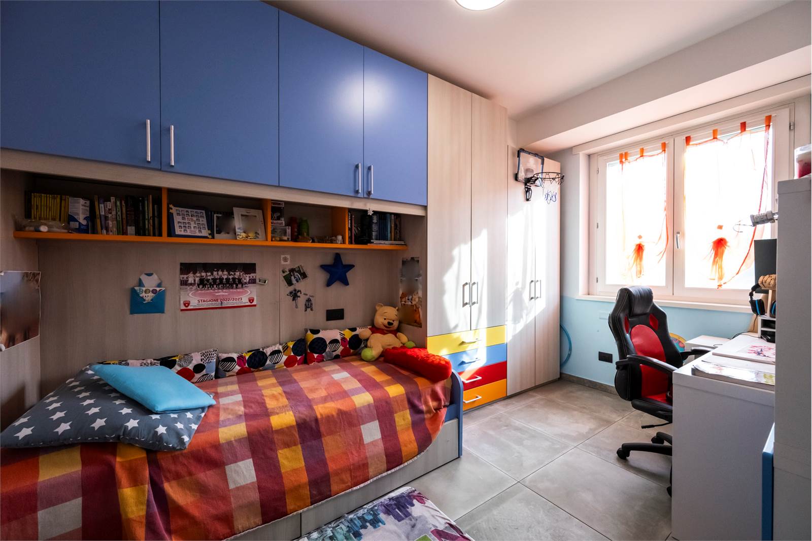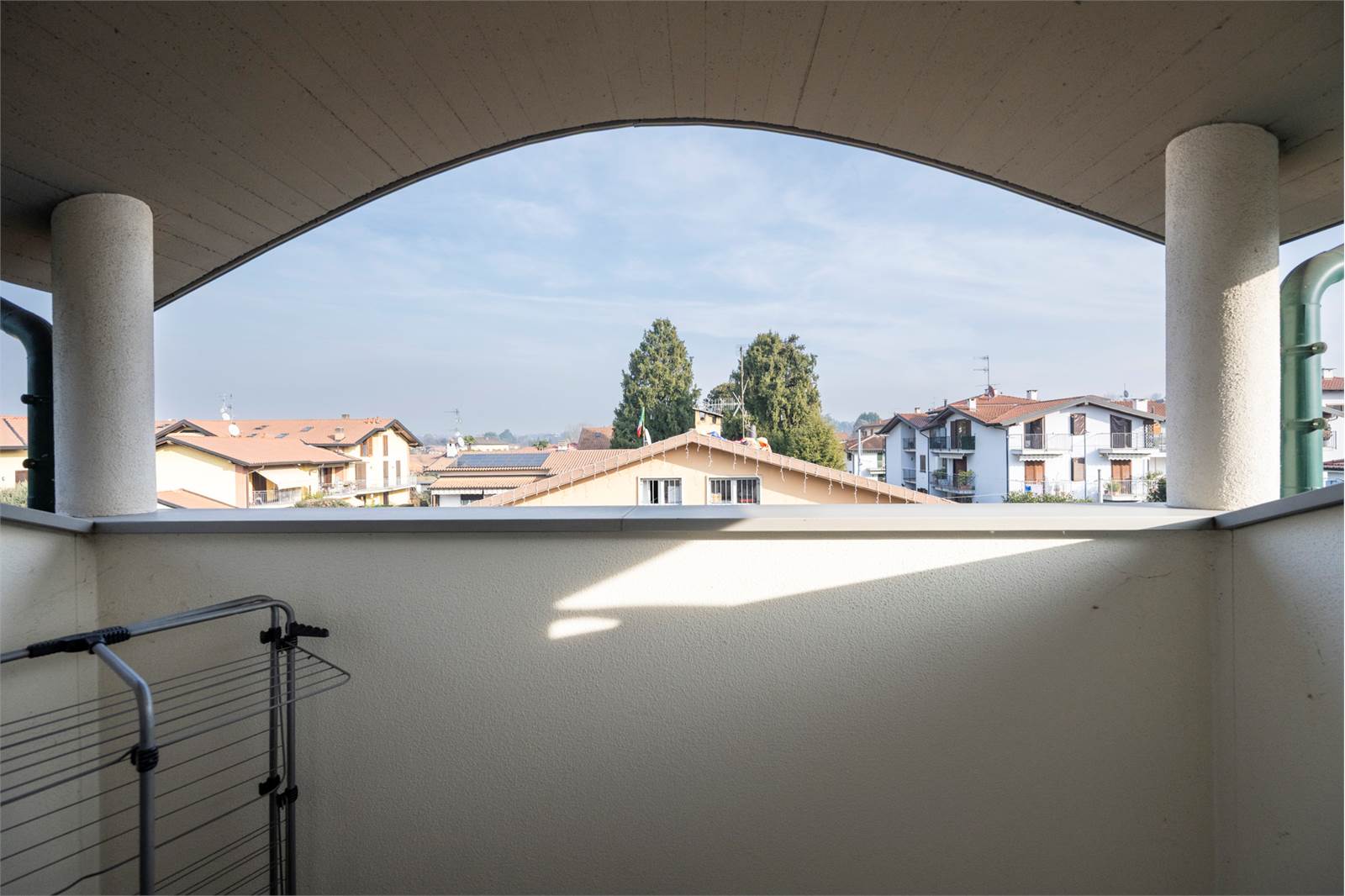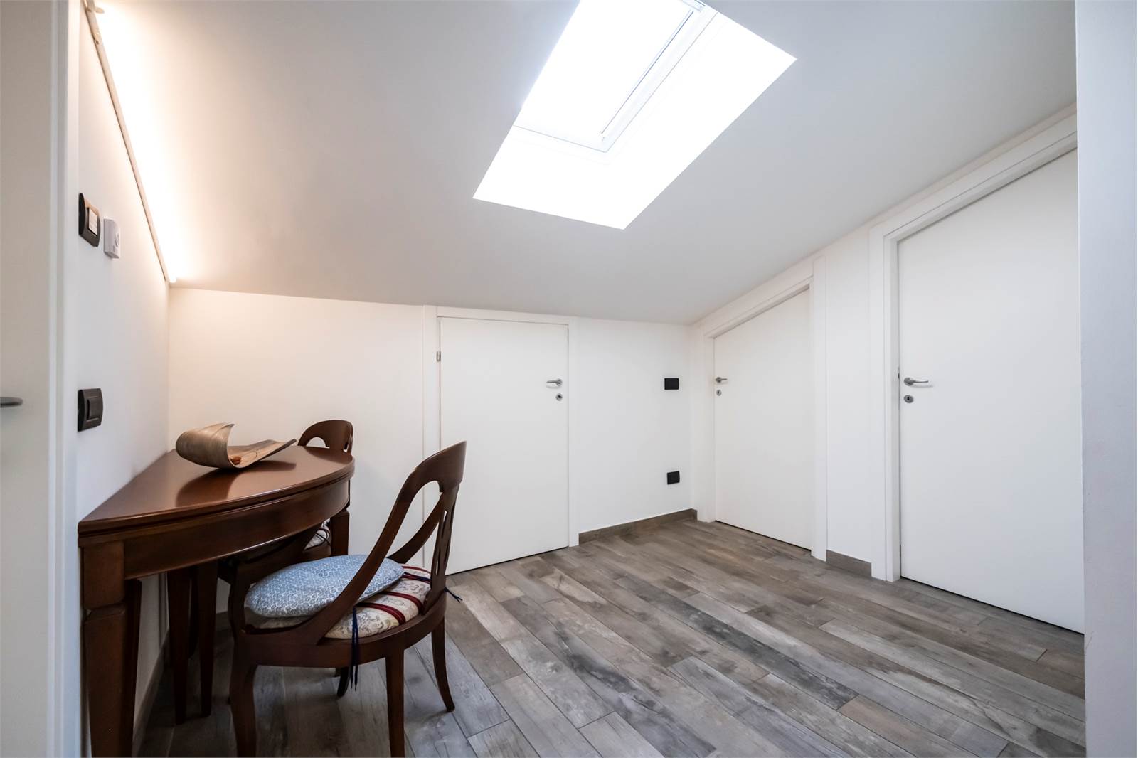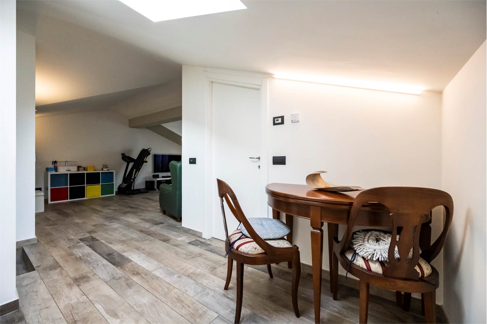 L’abitazione si sviluppa su due livelli: al piano primo si trovano un ampio e luminoso soggiorno con accesso a un terrazzino di circa 10 mq, una cucina abitabile, due camere da letto, un bagno finestrato con ampia doccia, due balconi. Al piano sottotetto, collegato internamente, si sviluppa un ampio locale agibile rifinito che offre spazi versatili e ben sfruttabili, e tre comodi ripostigli, bagno con doccia e uso lavanderia e terrazzino.