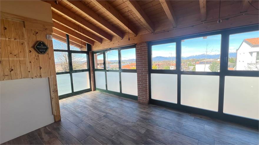 • Luminosità e Vista: Il locale è caratterizzato da ampie vetrate panoramiche con vista monti che inondano gli interni di luce naturale e offrono un affaccio suggestivo sulla piazza, creando un'atmosfera accogliente e scenografica.